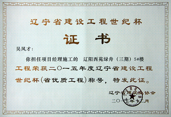 • 2015年遼寧省建設工程世紀杯(個人獎)